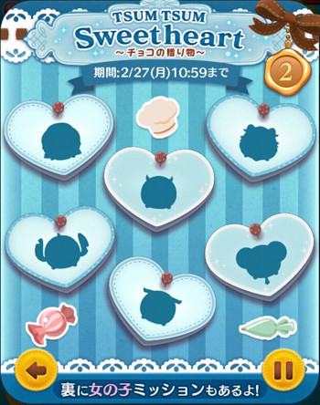 LINEディズニーツムツム(Tsum Tsum)では、現在2017年2月9日11:00〜バレンタインイベント「スイートハート(Sweet heart)~チョコの贈り物~」が登場しています。