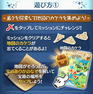 ミッションをクリアすると、地図のカケラが出てくることがありどんどん集めていきます。地図が揃い完成すると宝のありかの謎を解いて宝箱の場所をタップするようです。