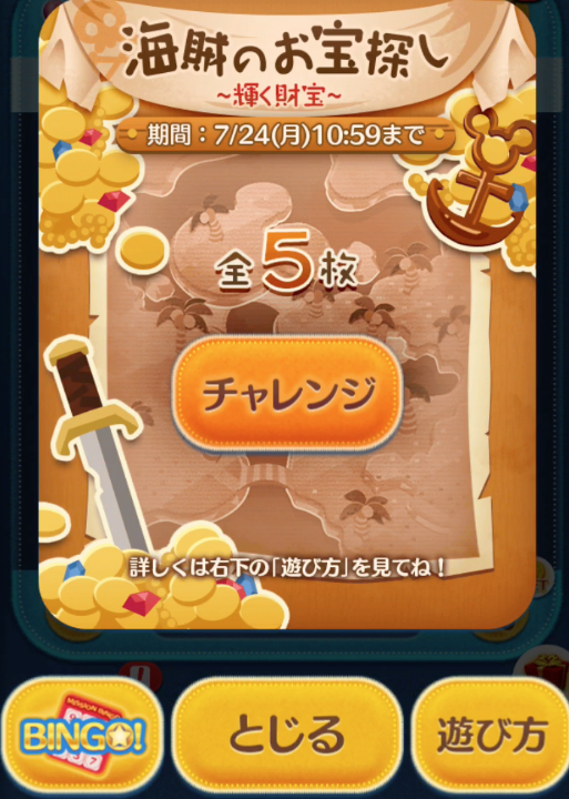 今回の海賊のお宝探しはミッション系のイベントになります。最近ではミッション系イベントばかりなのですが、コンボ、フィーバー、マジカルボムなどビンゴミッションに似たようなミッションが登場します。