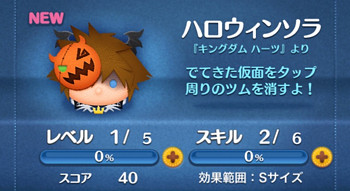 2017年10月に追加される新ツムのうち、キングダムハーツより「ハロウィンソラ」が登場します。スキルの表記的にスキルのコンサートミッキーのような、強力なスキルになる可能性もありますがスキル効果がSSサイズ~3Lサイズ表記なので、通常の消去系スキルになるのかもしれません。