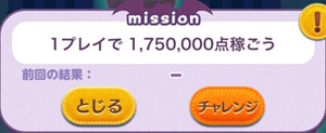 このミッションは、1プレイで175万点叩き出せばクリアです。普段から慣れている人は攻略できると思いますが、初心者の方は、消去系スキルのツムに5→4、+Scoreのアイテムをつけるとより攻略しやすいと思います。