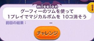 このミッションは、グーフィーのツムをマイツムにして、1プレイでマジカルボムを10個消せばクリアです。