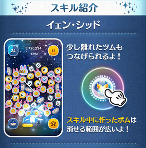 「ツムツムイェンシッド」「イェンシッドツムツム」のスキルは、「少しの間ツムがつなぎやすくなるよ!」という特殊系スキル。