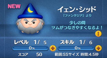 「イェン・シッド」はプレミアムBOXから出現し、「魔法使いの弟子」の曲付きとなります。さらに12月のイベント「ディズニーミュージックブックス」にて有利になるツムです。