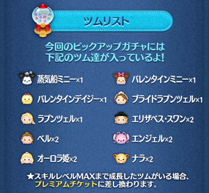 バレンタインシーズンということもあって、女の子のツムがラインナップになったピックアップガチャになります。