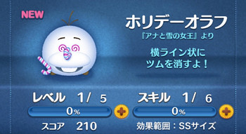 「ツムツムホリデーオラフ」のスキルは、「横ライン状にツムを消すよ!」という消去系スキル。