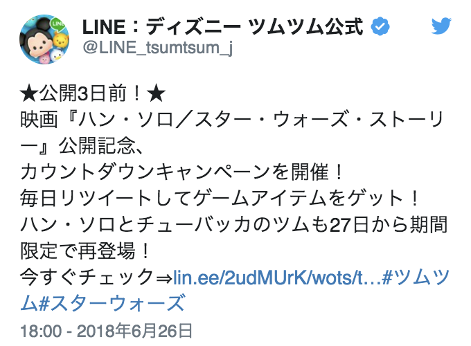 6月29日公開の映画「ハン・ソロ/スター・ウォーズ・ストーリー」公開を記念して、ツムツムの公式twitterでカウントダウンキャンペーンが開催されています。