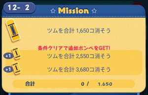 このミッションは、合計で1650個、2550個、3680個のツムを消すとクリアになります。