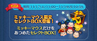 11/17(土) | 11:00~ ●セレクトBOXの2回目(ミッキーシリーズのセレクトBOX)開始 23:59 ミッキーのバースデーカウントダウンキャンペーン終了● |