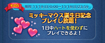 5つ目のキャンペーンは、ミッキー誕生日記念!プレイし放題キャンペーンが開催されます。