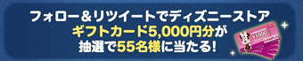 抽選で「ディズニーストアギフト 5,000円分」が55名様に当たるキャンペーンです。