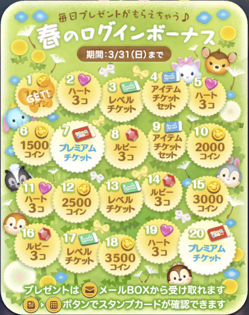 LINEディズニー ツムツム(Tsum Tsum)では、2019年3月に春のログインボーナスが開催されます。