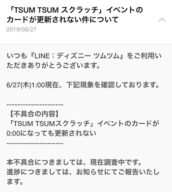 LINEディズニー ツムツム(Tsum Tsum)にて、2019年6月27日0時に追加予定の「ツムツムスクラッチ」4枚目・5枚目・6枚目が追加されていないという不具合が発生しています。