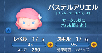 「パステルアリエル」のスキルは、サークル状にツムを消す消去系スキル。スキル名は通常アリエルと同じですが、スキルの内容は別になっており、アースラのように外側のツムを消していきます。