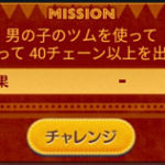 このミッションは、タイムボムを6個消すとクリアになります。 タイムボムは9~11チェーンで発生しやすいと言われています。 一番おすすめなのが特殊ボム発生スキル。ミスバニーやティモシー、スプリングミスバニーはランダムですが、スキルでタイムボムが作れるのでおすすめです。 さらに消去畏敬のとんすけはスキル4~5を使用すると、スキル効果で消す数がタイムボムのでやすい消去数で、さむがりピグレットはスキル効果終了後に必ず1個のタイムボムがでるので、スキル6回発動すればクリア可能です。 違うツムをつないで消すラプンツェルはスキル効果中に9~11チェーンを狙いながら攻略していきましょう。 ↓さらに詳しい攻略情報はこちら! 5枚目(おまけ2)枚目13個目のミッション「男の子のツムを使ってなぞって40チェーン以上を出そう」の攻略法です。