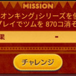 このミッションは、ツムを1プレイでマイツム、サブツム含む全920個消すとクリアになります。 指定数が多いので、ツムが育っていない場合は、5→4のアイテムはつけて攻略していきたいところです。 なお、新ツムを使った場合、50%のボーナスがつきます。約614個のツムを消すとクリアになりますので、新ツムが育っているのなら、新ツムがおすすめです。 5枚目(おまけ2)枚目5個目のミッション「「ライオンキング」シリーズを使って1プレイでツムを870個消そう」の攻略法です。