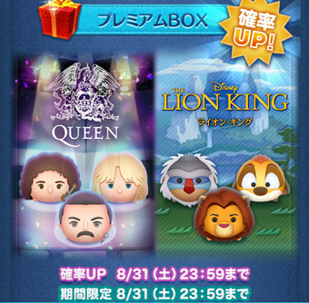 ライオンキングシリーズ「ハクナマタタシンバ」「ティモン」「ラフィキ」の3体の計6体の確率アップキャンペーンが行われます。期間限定のQUEENツム3体&ハクナマタタシンバを入手するラストチャンス!
