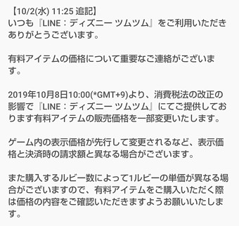 その点を考えると、ツムツムも2019年10月1日0時以降は新しい価格になると思われます。