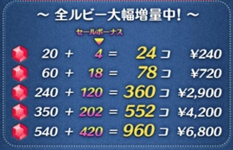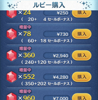 この期間は、ルビーの値段はそのままで、ルビーの数が20%増量するのですが、おそらく値段は上がっても、ルビーセール時は20%増量のままにするとおもわれます。