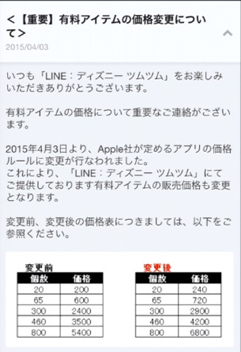 ツムツムでは、過去にApple社の価格改定のため、2015年4月に一度値上げしており、値上げするのは実はこれが2回目なんです。