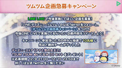 LINE:ディズニー ツムツムでは今後LINE LIVEで見てみたい企画を大募集!#ツムツム企画急募キャンペーン を付けてツイートしよう!抽選で10名様に「ディズニーストア 『アナと雪の女王2』TSUM TSUM ぬいぐるみ(S)セット」をプレゼント!