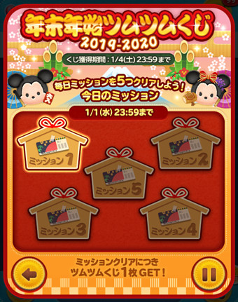 2019年12月~2020年1月イベント「年末年始ツムツムくじ」の12月30日では、毎日5個のミッションが出されます。