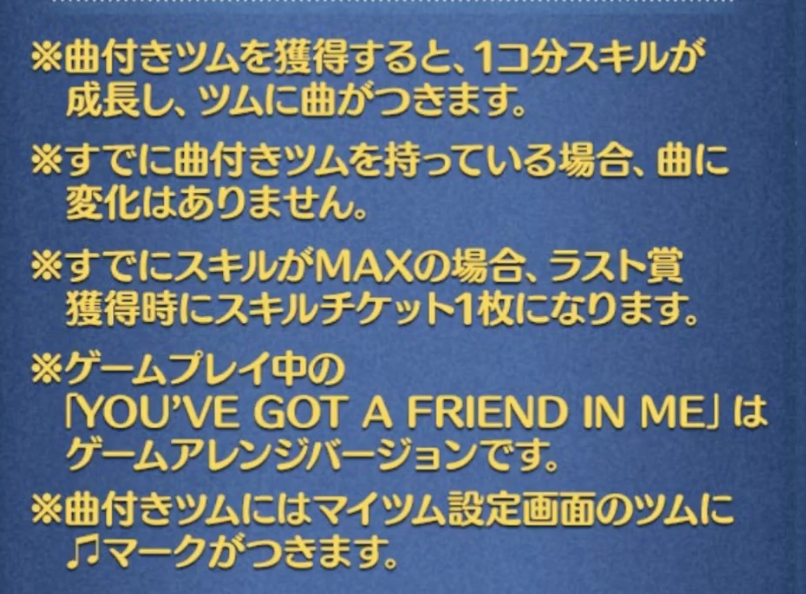 既にウッディ保安官に曲がついていてスキルマではない方にとっては、スキルチケットはもらえないし、ウッディ保安官のスキルレベルが上がるだけになります。