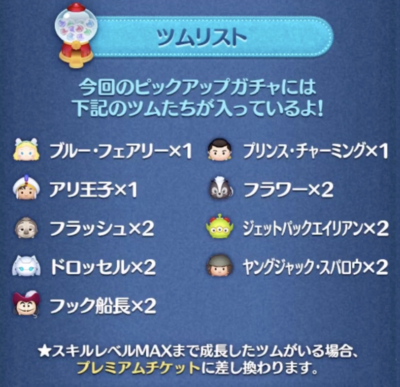 スキルマのツムがいる場合は、プレミアムチケットの確率が表示され、スキルマのツム数が多いほど、プレミアムチケットの排出率が高くなります。