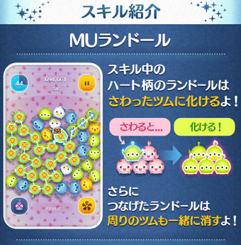 最初にタップしたツムに化けるという、今までにないスキルであり化けているMUランドールは周りも巻き込んで消します。