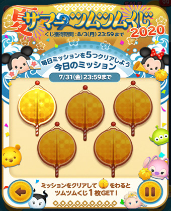 2020年7月25日~2020年8月3日イベント「サマーツムツムくじ」の7月31日では、毎日5個のミッションが出されます。