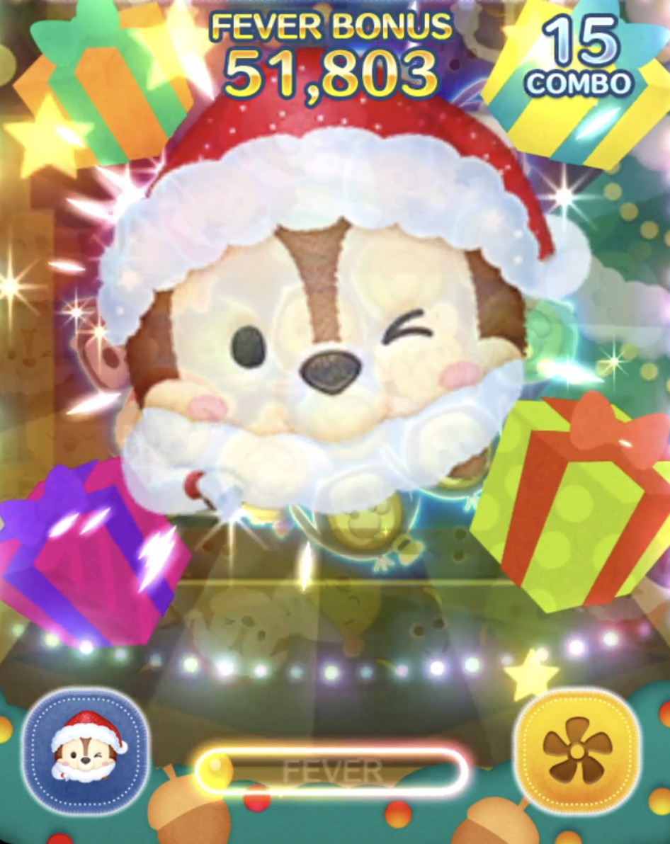 「サンタチップ」のスキルは、フィーバーがはじまり画面中央のツムをまとめて消すよ!というフィーバー発生系+消去系となっています。