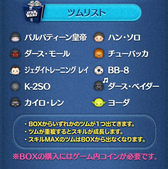 LINEディズニー ツムツム(Tsum Tsum)では、2020年12月セレクトBOX(セレクトボックス/セレクトガチャ)1回目は、スターウォーズシリーズのみがラインナップになっています。