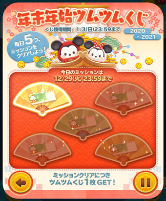 2020年12月~2021年1月イベント「年末年始ツムツムくじ」の12月29日では、毎日5個のミッションが出されます。