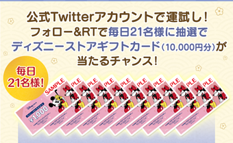 今回のキャンペーンは、該当のツイートをRTすると抽選で「ディズニーストアギフトカード10,000円分」が当たるという内容で、27日~30日までの期間に毎日21名様に当たるチャンス!