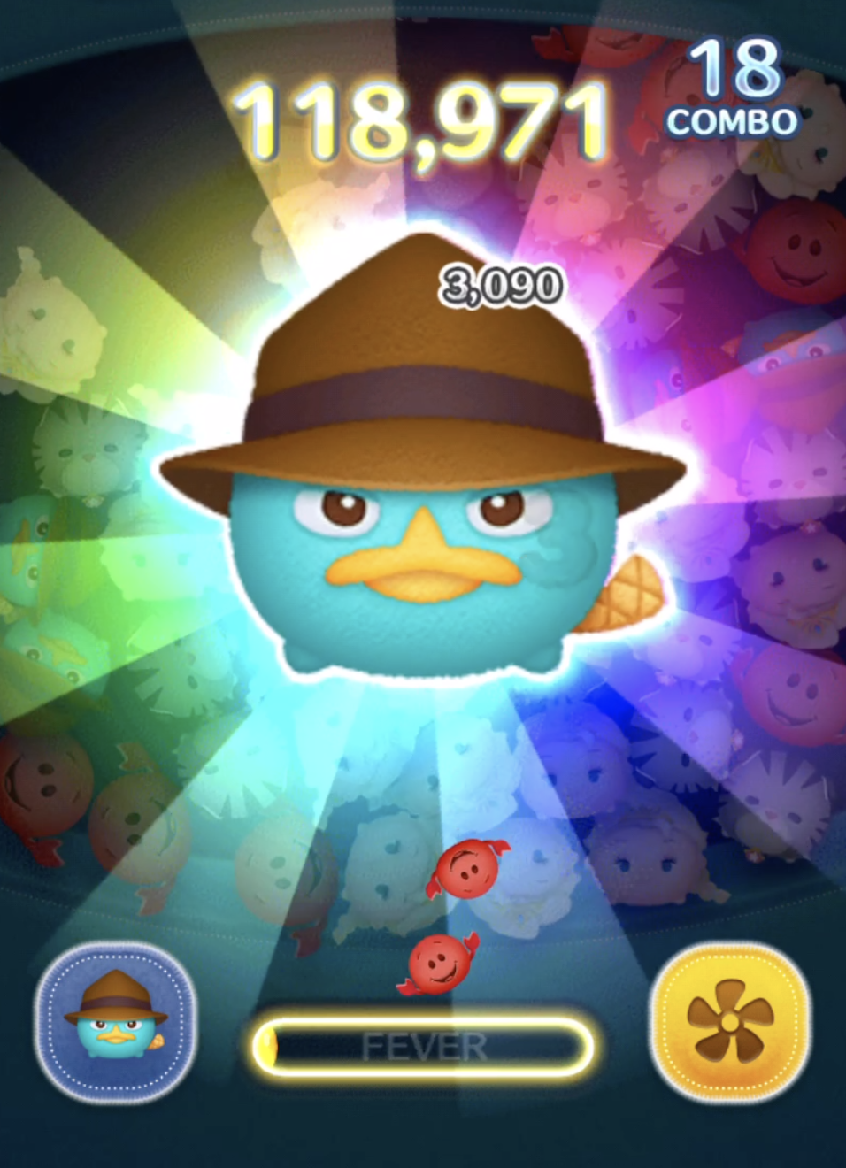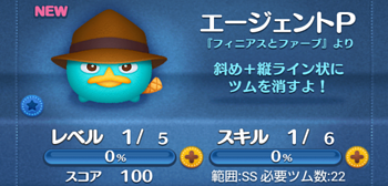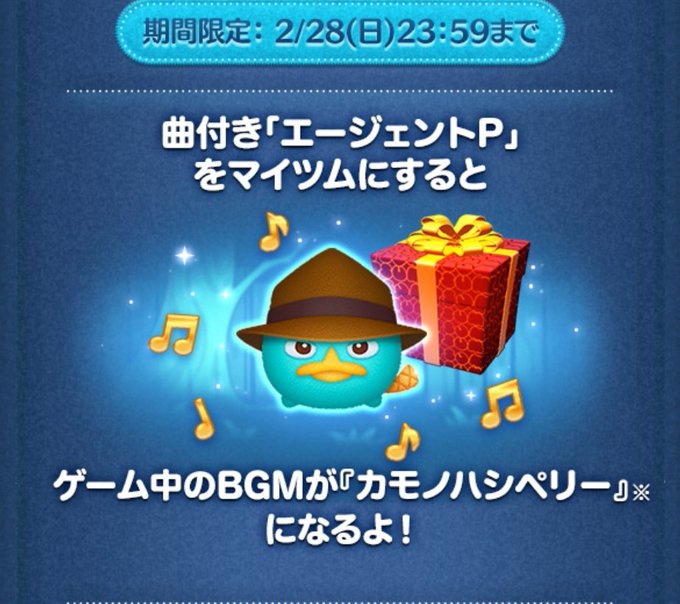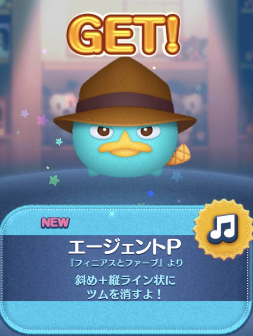 「エージェントP」は、プレミアムBOXから低確率で出現する期間限定ツムになります。さらに「カモノハシペリー」の曲付きツムです。