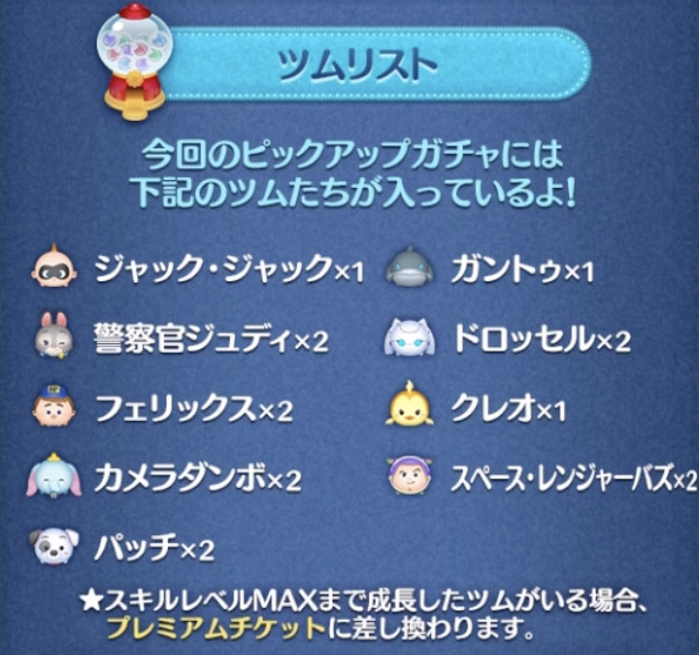 スキルマのツムがいる場合は、プレミアムチケットの確率が表示され、スキルマのツム数が多いほど、プレミアムチケットの排出率が高くなります。