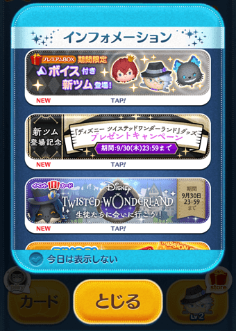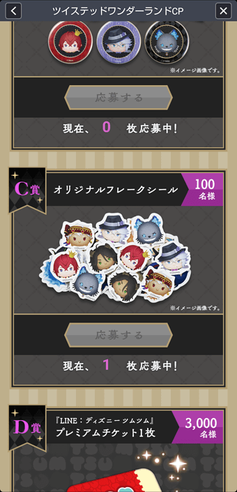 このキャンペーンは、今日のミッションをクリアしてもらえる応募券で応募が可能で、ツイステグッズやツムツム内で使えるプレミアムチケットやコインが当たるキャンペーンです。