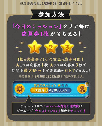 応募券は「今日のミッション」クリアで入手が可能であり、今日のミッションを1個クリアごとに1枚、1日に最大3枚の応募券がもらえます。