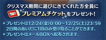 12月24日~25日の間に一度でもログインすれば、メールBOXにプレミアムチケットが送られます。