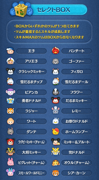 今回のセレクトBOXのラインナップは以下のツムが対象になっています。