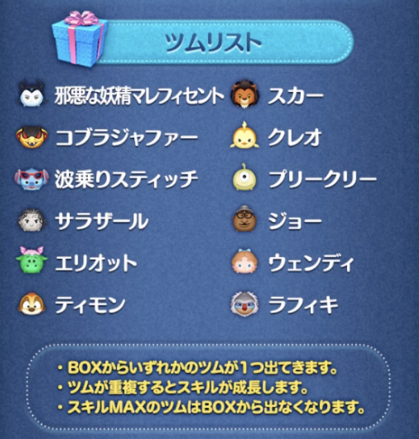 今回のセレクトBOXは初めて復活登場するツムはいません。