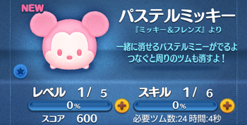 「パステルミッキー」のスキルは、「一緒に消せるパステルミニーがでるよ つなぐと周りのツムも消すよ!」という特殊系スキル。
