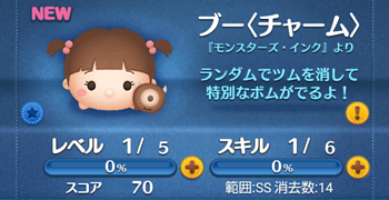 「ブー(チャーム)」のスキルは「ランダムでツムを消して特別なボムがでるよ!」という消去系+ボム発生系スキル。