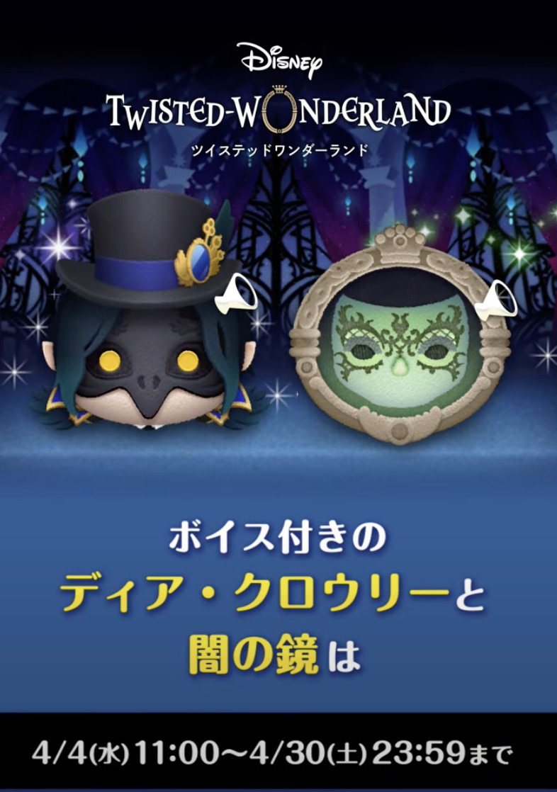 4/1(金) | 0:00~ ●新ツム第1弾:ツイステッドワンダーランドシリーズ3体追加&確率アップ