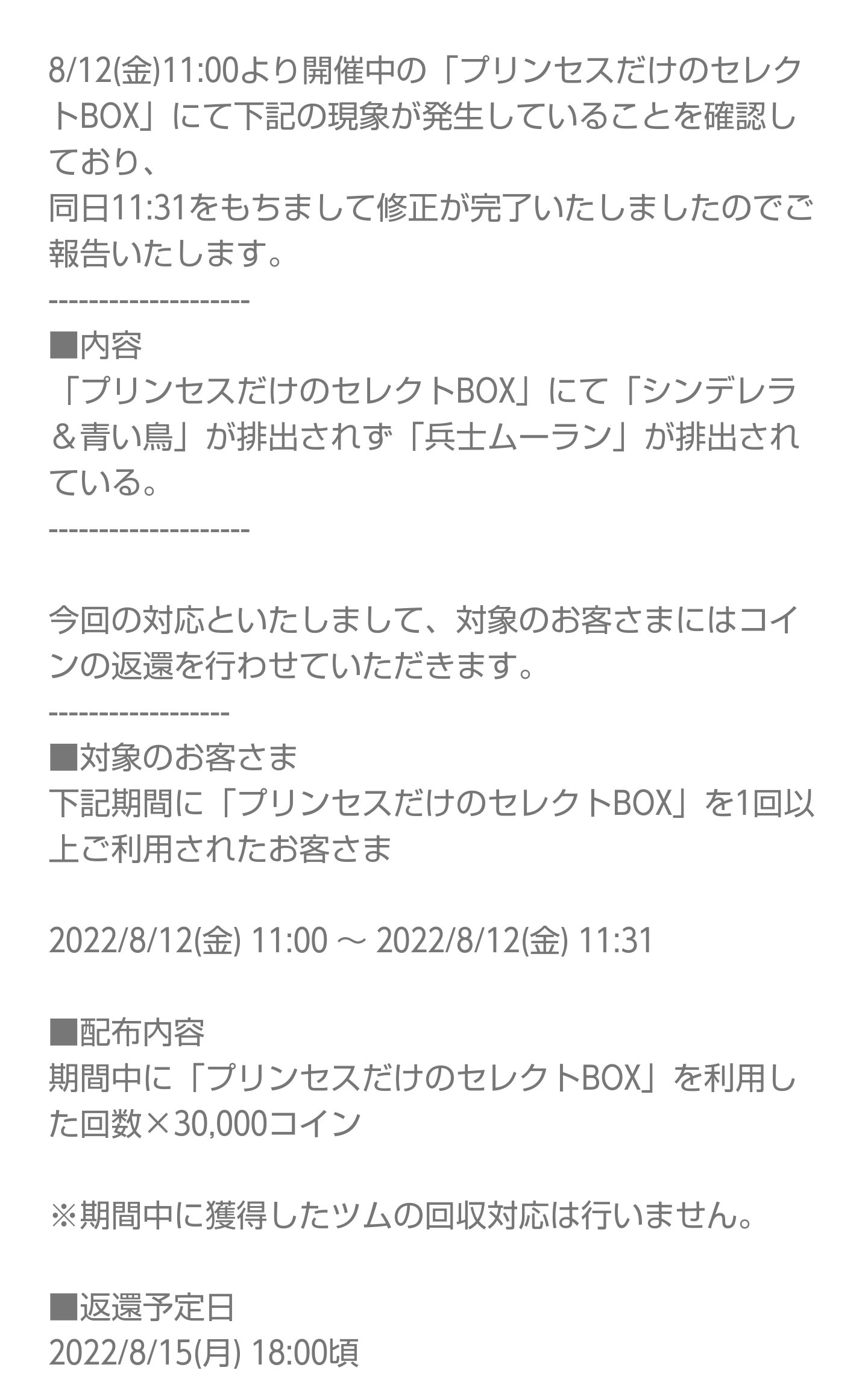 | 配布対象 | 8月12日11:00〜11:31の間にプリンセスだけのセレクトBOXを引いた方 |