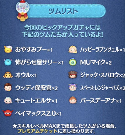 スキルマのツムがいる場合は、プレミアムチケットの確率が表示され、スキルマのツム数が多いほど、プレミアムチケットの排出率が高くなります。
