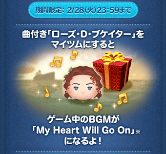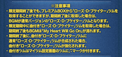 →ちなみに、注意事項のところに「ローズ・D・ブケイター」は曲付きツムが2月28日までの期間限定であり、その後は常駐ツムとしてプレミアムBOXから入手可能との趣旨が記載されていました。