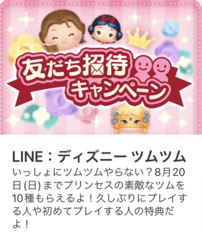 この友達招待キャンペーンは、ツムツムをプレイしていない人を招待し、招待された友達がツムツムを遊ぶことでキャンペーンガチャを回すことができて、プリンセスツムいずれかが当たるというもの。