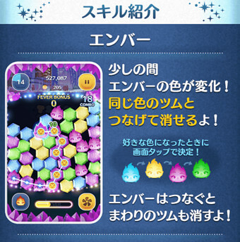 スキル名 | 少しの間エンバーの色が変わってつなぐとまわりのツムを消すよ! |