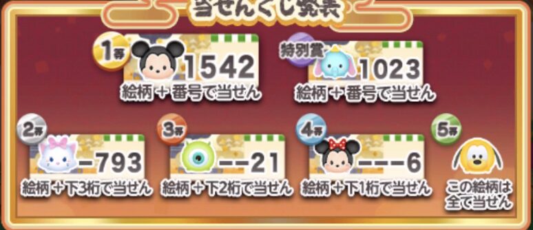 ツムの絵柄+番号が一致で当選となります。